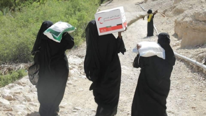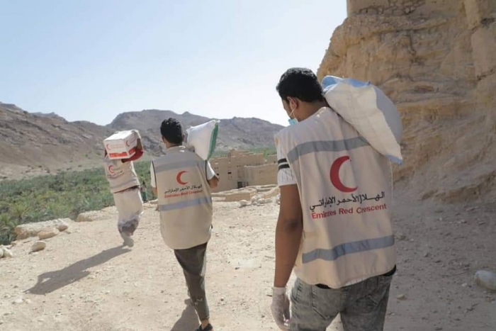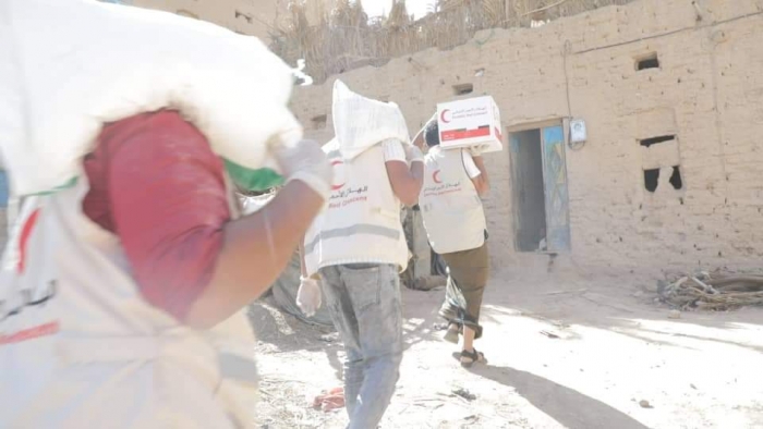 الهلال الإماراتي يوزع 1000 سلة غذائية على أهالي حجر بحضرموت (صور)