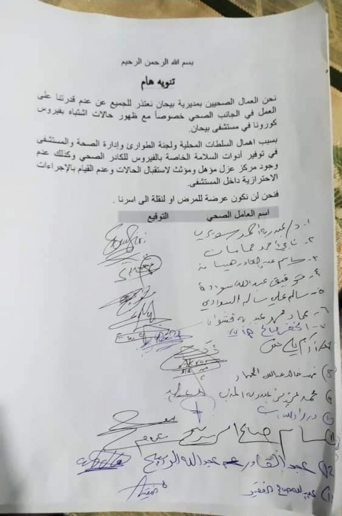 أعلن الكادر الطبي بمستشفى بيحان التوقف عن العمل وعدم تقديم أية خدمات صحية، في ظل استمرار إهمال مليشيا الإخوان بشبوة وعدم توفيرها الدعم لمواجهة زيادة حالات "كورونا".