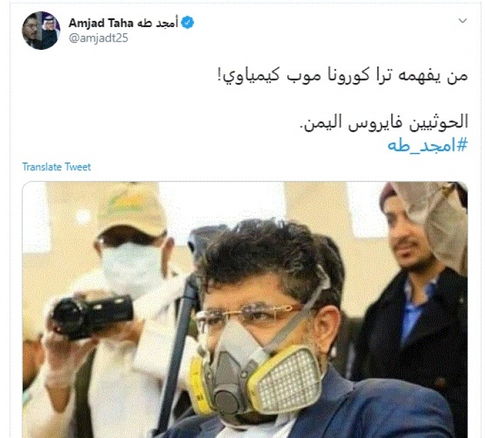 وقال في تغريدة عبر "تويتر" رصدها "المشهد العربي": "من يفهمه ترا كورونا مو كيمياوي؛ الحوثيين فيروس اليمن".