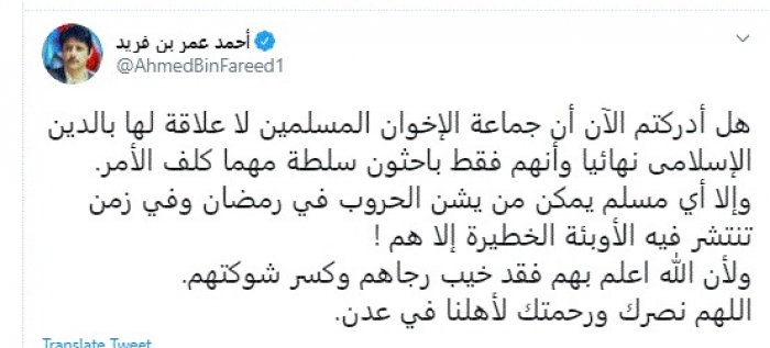 وأضاف: "وإلا أي مسلم يمكن من يشن الحروب في رمضان وفي زمن تنتشر فيه الأوبئة الخطيرة إلا هم! ولأن الله اعلم بهم فقد خيب رجاهم وكسر شوكتهم. اللهم نصرك ورحمتك لأهلنا في عدن".