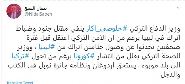 وكتب في تغريدة عبر "تويتر" رصدها "المشهد العربي": "وزير الدفاع التركي خلوصي اكار ينفي مقتل جنود وضباط أتراك في ليبيا برغم من أن الأمن التركي اعتقل قبل فترة صحفيين تحدثوا عن وصول جثامين أتراك من ليبيا".