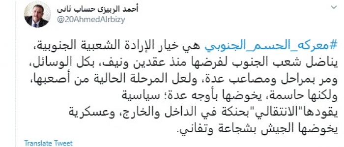 وكتب في تغريدة عبر "تويتر" رصدها "المشهد العربي": "معركة الحسم الجنوبي هي خيار الإرادة الشعبية الجنوبية، يناضل شعب الجنوب لفرضها منذ عقدين ونيف، بكل الوسائل، ومر بمراحل ومصاعب عدة".