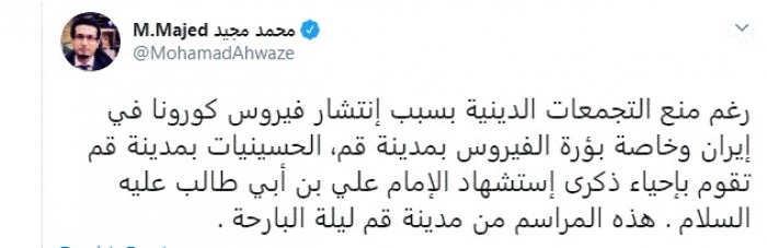 وقال في تغريدة عبر "تويتر" رصدها "المشهد العربي": "رغم منع التجمعات الدينية بسبب انتشار فيروس كورونا في إيران وخاصة بؤرة الفيروس بمدينة قم، الحسينيات بمدينة قم تقوم بإحياء ذكرى استشهاد الإمام علي بن أبي طالب عليه السلام . هذه المراسم من مدينة قم ليلة البارحة".
