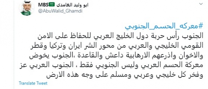 وقال في تغريدة عبر "تويتر" رصدها "المشهد العربي": "الجنوب رأس حربة دول الخليج العربي للحفاظ على الأمن القومي الخليجي والعربي من محور الشر إيران وتركيا وقطر والإخوان وأذرعهم الإرهابية داعش والقاعدة".