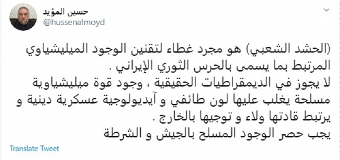 طالب الباحث السياسي العراقي حسين المؤيد، اليوم، بحصر السلاح التابع لمليشيات الحشد الشعبي في العراق.