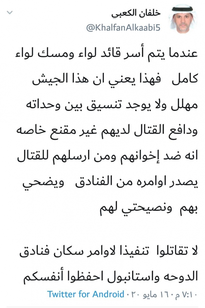 وكتب "الكعبي" في تغريدة عبر حسابه الشخصي بتويتر، رصدها "المشهد العربي" : "عندما يتم أسر قائد لواء ومسك لواء كامل، فهذا يعني أن هذا الجيش مهلل ولا يوجد تنسيق بين وحداته ودافع القتال لديهم غير مقنع خاصة أنه ضد إخوانهم ومن أرسلهم للقتال يصدر أوامره من الفنادق ويضحي بهم ".