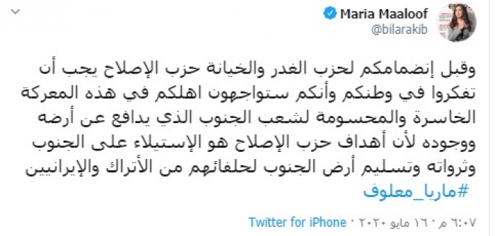 وكتبت "معلوف" في تغريدة عبر حسابه بتويتر، رصدها "المشهد العربي" قالت فيها: "وقبل انضمامكم لحزب الغدر والخيانة حزب الإصلاح يجب أن تفكروا في وطنكم وأنكم ستواجهون أهلكم في هذه المعركة الخاسرة والمحسومة لشعب الجنوب الذي يدافع عن أرضه ووجوده لأن أهداف حزب الإصلاح هو الاستيلاء على الجنوب وثرواته وتسليم أرض الجنوب لحلفائهم من الأتراك والإيرانيين".