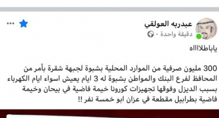 وكتب "بن فريد" في تغريدة عبر حسابه بتويتر، رصدها "المشهد العربي": "عبث محافظ شبوة أو وكيل تنظيم الإخوان المسلمين في شبوة وهو ينفق ٣٠٠ مليون ريال من المال العام للمحافظة لدعم عزيز وقواته ولاستغلال عوز الشباب والدفع بهم إلى المحارق فيما تعيش شبوة أسوأ أوضاعها في الكهرباء كما في المنشور المرفق" .