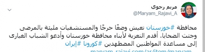 وكتبت رجوي عبر تغريدة لها على "تويتر" رصدها " المشهد العربي": "محافظة خوزستان تعيش وضعًا حرجًا والمستشفيات مليئة بالمرضى وجثث الضحايا".