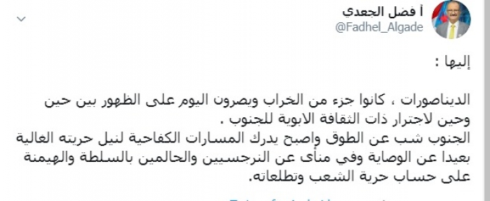 وكتب الجعدي عبر تغريدة له على "تويتر" رصدها " المشهد العربي": "الديناصورات، كانوا جزء من الخراب ويصرون اليوم على الظهور بين حين وحين لاجترار ذات الثقافة الأبوية للجنوب".