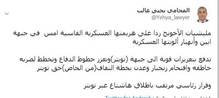 وكتب غالب عبر تغريدة له على "تويتر" رصدها " المشهد العربي": "مليشيات الإخونج ردا على هزيمتها العسكرية القاسية أمس في جبهة أبين وانهيار ألويتها العسكرية تدفع بتعزيزات قوية إلى جبهة (تويتر) وتعزز خطوط الدفاع وتخطط لضربه خاطفة واقتحام زنجبار وعدن بخطة التفاف(من الخاص)حق تويتر".