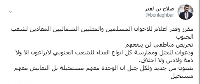 وكتب بن لغبر عبر تغريدة له على "تويتر" رصدها " المشهد العربي": "مقزز وقذر إعلام الإخوان المسلمين والـ... الشماليين المعادين لشعب الجنوب".