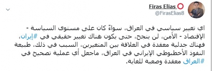 وكتب عبر تغريدة له على "تويتر رصدها " المشهد العربي":"إي تغيير سياسي في العراق، سواءً كان على مستوى السياسة - الاقتصاد - الأمن، لن ينجح، حتى يكون هناك تغيير حقيقي في إيران".