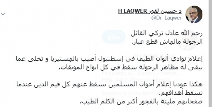 وكتب لقور عبر تغريدة له على "تويتر":"رحم الله عادل تركي القائل الرجولة مالهاش قطع غيار، إعلام نوادي ألوان الطيف في إسطنبول أصيب بالهستيريا و تخلى عما تبقى له مظاهر الرجولة سقط في كل أنواع الموبقات".