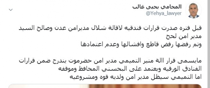 وأضاف:" مايسمى قرار إقالة منير التميمي مدير أمن حضرموت يندرج ضمن قرارات الفنادق الورقية ويعتمد على البحسني المحافظ وموقفه، أما التميمي سيظل مدير أمن ولديه قوة ومشروعية".