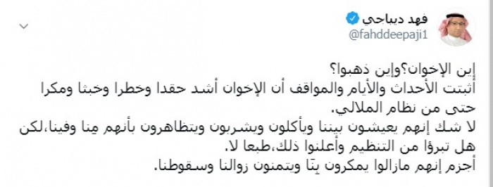 وكتب ديباجي عبر تغريدة له على "تويتر" رصدها " المشهد العربي": "أين الإخوان، وأين ذهبوا؟ أثبتت الأحداث والأيام والمواقف أن الإخوان أشد حقدا وخطرا وخبثا ومكرا حتى من نظام الملالي".