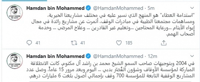 وكتب في تغريدات عبر "تويتر" رصدها "المشهد العربي": "في 2004 وبتوجيهات صاحب السمو الشيخ محمد بن راشد آل مكتوم، كانت الانطلاقة المباركة لمؤسسة الأوقاف وشؤون القُصّر بدبي ... اليوم وبعد مرور 15 عاماً، وصل عدد المشاريع الوقفية التابعة للمؤسسة 700 وقف بإجمالي أصول بلغت 6 مليارات درهم".