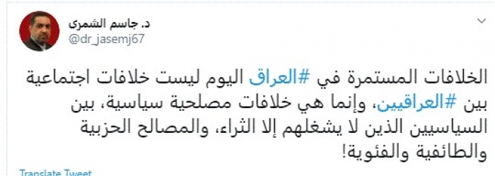 وقال في تغريدة عبر "تويتر" رصدها "المشهد العربي": "الخلافات المستمرة في العراق اليوم ليست خلافات اجتماعية بين العراقيين، وإنما هي خلافات مصلحية سياسية، بين السياسيين الذين لا يشغلهم إلا الثراء، والمصالح الحزبية والطائفية والفئوية".