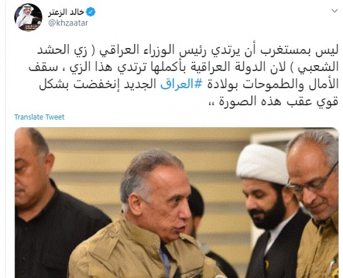 انتقد المحلل السياسي السعودي خالد الزعتر، اليوم، ارتداء رئيس الوزراء العراقي مصطفى الكاظمي لزي الحشد الشعبي.