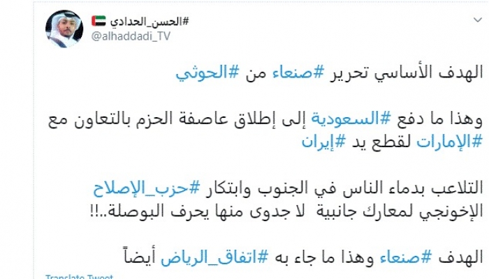 وقال في تغريدة عبر "تويتر" رصدها "المشهد العربي": "الهدف الأساسي تحرير صنعاء من الحوثي وهذا ما دفع السعودية إلى إطلاق عاصفة الحزم بالتعاون مع الإمارات لقطع يد إيران".