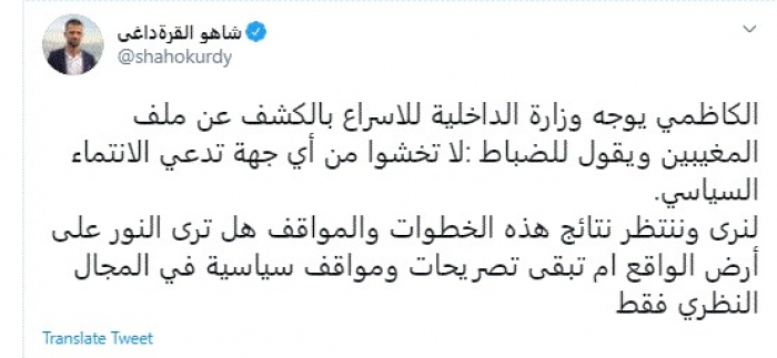 علق الكاتب الصحفي العراقي شاهو القرةداغي، اليوم، على توجيه رئيس الوزراء العراقي مصطفى الكاظمي لوزارة الداخلية بالكشف عن ملف المغيبين.