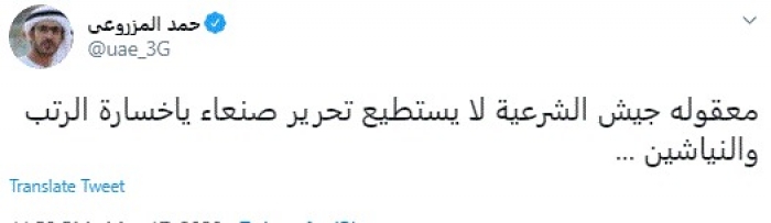 هاجم الكاتب الإماراتي حمد المزروعي، ما يسمى بالجيش الوطني التابع لحكومة الشرعية، وذلك جراء فشله في تحرير صنعاء من مليشيات الحوثي.