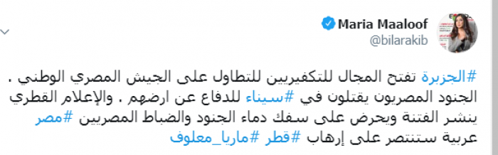 شنت الإعلامية اللبنانية ماريا معلوف، اليوم الإثنين، هجوما عنيفا على قناة الجزيرة القطرية، بسبب فتحها المجال للتكفيريين للتطاول على الجيش المصري الوطني.