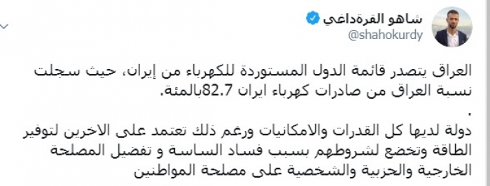 وكتب عبر تغريدة له على "تويتر" رصدها " المشهد العربي": "العراق يتصدر قائمة الدول المستوردة للكهرباء من إيران، حيث سجلت نسبة العراق من صادرات كهرباء ايران 82.7بالمئة".