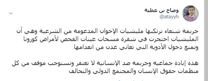 وكتب بن عطية عبر تغريدة له على "تويتر" رصدها " المشهد العربي": "جريمة شنعاء ترتكبها مليشيات الإخوان المدعومة من الشرعية وهي أن المليشيات احتجزت في شقرة مسحات عينات الفحص لأمراض كورونا وتمنع دخول الأدوية التي تعاني عدن من انعدامها"