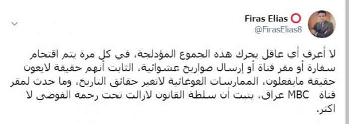 وأضاف:" الممارسات الغوغائية لا تغير حقائق التاريخ، وما حدث لمقر قناة MBC عراق، يثبت أن سلطة القانون لازالت تحت رحمة الفوضى لا أكثر".