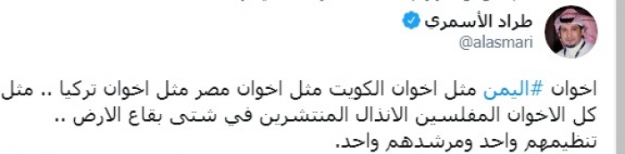 وكتب الأسمري عبر تغريدة له على "تويتر" :" إخوان اليمن مثل إخوان الكويت مثل إخوان مصر مثل إخوان تركيا، مثل كل الاخوان المفلسين الانذال المنتشرين في شتى بقاع الأرض،  تنظيمهم واحد ومرشدهم واحد.