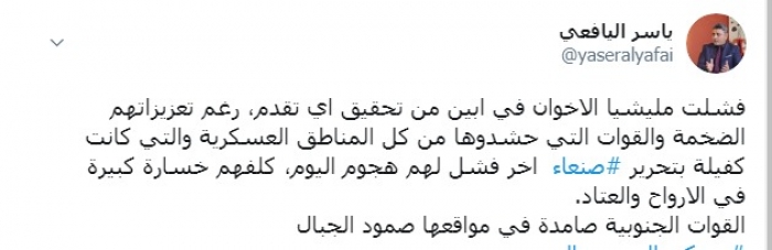 وكتب عبر تغريدة له على "تويتر" رصدها " المشهد العربي": "فشلت مليشيا الإخوان في أبين من تحقيق أي تقدم، رغم تعزيزاتهم الضخمة والقوات التي حشدوها من كل المناطق العسكرية والتي كانت كفيلة بتحرير صنعاء".