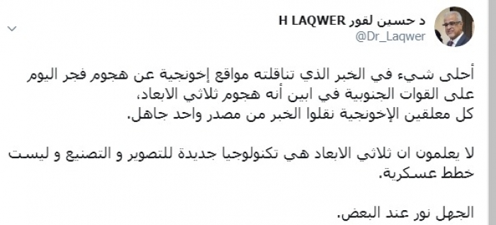 وكتب لقور عبر تغريدة له على "تويتر" رصدها " المشهد العربي": "أحلى شيء في الخبر الذي تناقلته مواقع إخونجية عن هجوم فجر اليوم على القوات الجنوبية في أبين أنه هجوم ثلاثي الأبعاد، كل معلقين الإخونجية نقلوا الخبر من مصدر واحد جاهل".