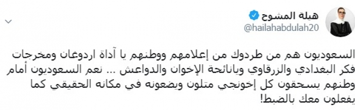 وكتبت عبر تغريدة لها على "تويتر" رصدها " المشهد العربي":" السعوديون هم من طردوك من إعلامهم ووطنهم يا آداة اردوغان ومخرجات فكر البغدادي والزرقاوي ويانائحة الإخوان والدواعش".