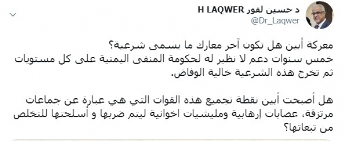 وتساءل لقور عبر تغريدة له على "تويتر" رصدها "المشهد العربي":"معركة أبين هل تكون آخر معارك ما يسمى شرعية؟".