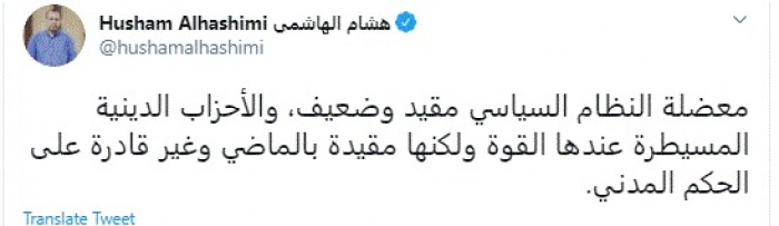 وقال في تغريدة عبر "تويتر" رصدها "المشهد العربي": "معضلة النظام السياسي مقيد وضعيف، والأحزاب الدينية المسيطرة عندها القوة ولكنها مقيدة بالماضي وغير قادرة على الحكم المدني".