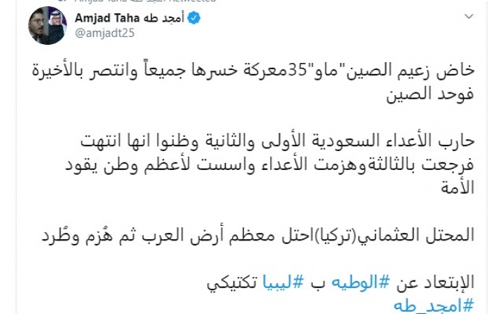 وقال في تغريدة عبر "تويتر" رصدها "المشهد العربي": "خاض زعيم الصين ماو 35معركة خسرها جميعاً وانتصر بالأخيرة فوحد الصين حارب الأعداء السعودية الأولى والثانية وظنوا أنها انتهت فرجعت بالثالثة وهزمت الأعداء وأسست لأعظم وطن يقود الأمة".