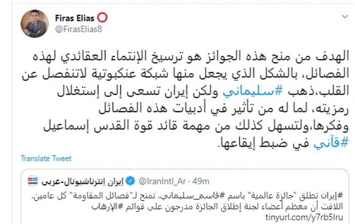 اعتبر الباحث السياسي العراقي فراس إلياس، اليوم، إن إطلاق إيران لجائزة تطلق باسم قاسم سليماني تمنح لما تسمى بفصائل المقاومة كل عامين ما هو إلا ترسيخ لانتماء تلك الفصائل لنظام الملالي.