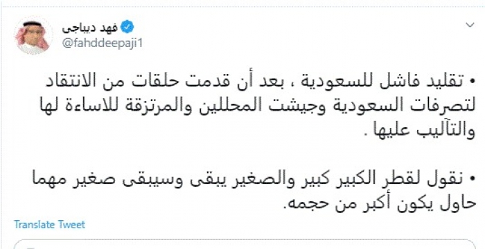 وقال في تغريدة عبر "تويتر" رصدها "المشهد العربي": "تقليد فاشل للسعودية، بعد أن قدمت حلقات من الانتقاد لتصرفات السعودية وجيشت المحللين والمرتزقة للإساءة لها والتآليب عليها".