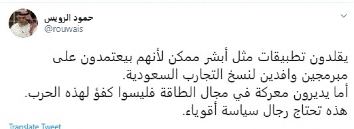 وقال في تغريدة عبر "تويتر" رصدها "المشهد العربي": "يقلدون تطبيقات مثل أبشر ممكن لأنهم بيعتمدون على مبرمجين وافدين لنسخ التجارب السعودية".