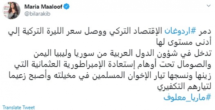 قالت الإعلامية اللبنانية ماريا معلوف، اليوم، إن الرئيس التركي رجب طيب أردوغان دمر الاقتصاد التركي جراء تدخله في شؤون الدول العربية.
