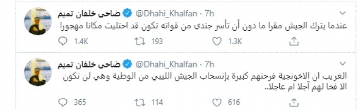 وقال في تغريدة عبر "تويتر" رصدها "المشهد العربي": "الغريب أن الإخونجية فرحتهم كبيرة بانسحاب الجيش الليبي من الوطية وهي لن تكون إلا فخًا لهم آجلا أم عاجلاً".