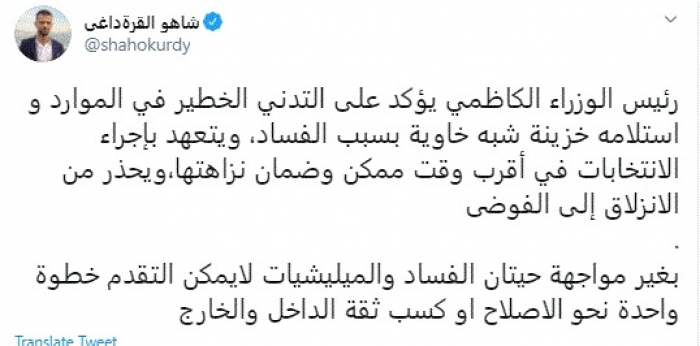 وجه الكاتب الصحفي العراقي شاهو القرةداغي، رسالة هامة لرئيس الوزراء العراقي مصطفى الكاظمي، مُطالبًا إياه بمواجهة حيتان الفساد ومليشيات إيران.