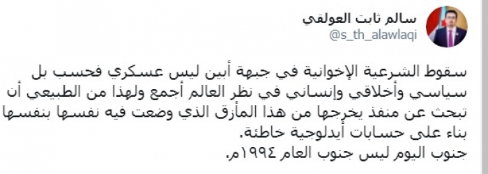 وكتب العولقي عبر تغريدة له على "تويتر" رصدها " المشهد العربي":"سقوط الشرعية الإخوانية في جبهة أبين ليس عسكري فحسب بل سياسي وأخلاقي وإنساني في نظر العالم أجمع، ولهذا من الطبيعي أن تبحث عن منفذ يخرجها من هذا المأزق الذي وضعت فيه نفسها بنفسها بناء على حسابات أيدلوجية خاطئة".
