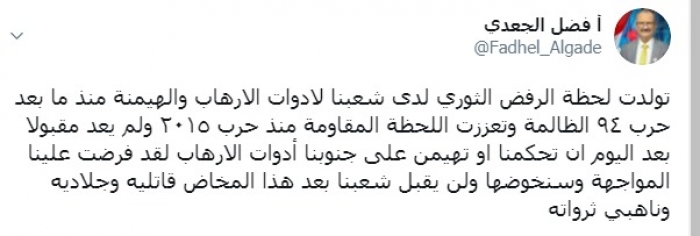 وكتب الجعدي عبر تغريدة له على "تويتر" رصدها " المشهد العربي": "تولدت لحظة الرفض الثوري لدى شعبنا لأدوات الإرهاب والهيمنة منذ ما بعد حرب 94 الظالمة وتعززت اللحظة المقاومة منذ حرب 2015 ولم يعد مقبولا بعد اليوم أن تحكمنا أو تهيمن على جنوبنا أدوات الإرهاب".