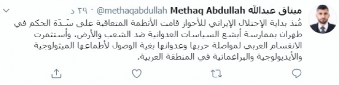 وكتب عبد الله عبر تغريدة له على "تويتر" رصدها " المشهد العربي":" مُنذ بداية الاحتلال الإيراني للأحواز قامت الأنظمة المتعاقبة على سَـدّة الحكم في طهران بممارسة أبشع السياسات العدوانية ضد الشعب والأرض".