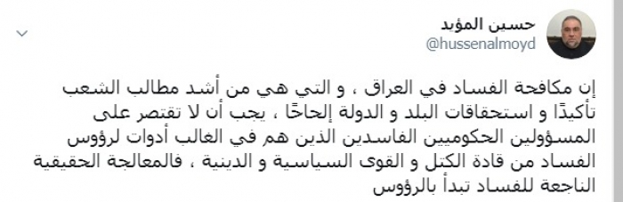 وكتب عبر تغريدة له على "تويتر" رصدها : المشهد العربي":"إن مكافحة الفساد في العراق ، و التي هي من أشد مطالب الشعب تأكيدًا و استحقاقات البلد و الدولة ، يجب أن لا تقتصر على المسؤولين الحكوميين الفاسدين الذين هم في الغالب أدوات لرؤوس الفساد من قادة الكتل و القوى السياسية و الدينية ، فالمعالجة الحقيقية الناجعة للفساد تبدأ بالرؤوس".