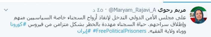 وكتبت رجوي عبر تغريدة لها على "تويتر" رصدها " المشهد العربي": "على مجلس الأمن الدولي التدخل لإنقاذ أرواح السجناء خاصة السياسيين منهم وإطلاق سراحهم".