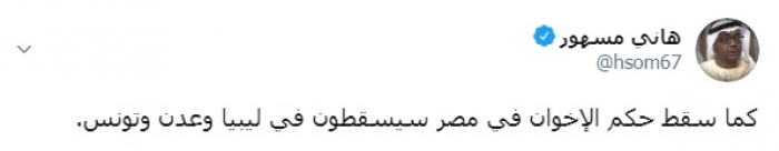 وكتب مسهورعبر تغريدة له على "تويتر" رصدها "المشهد العربي":" كما سقط حكم الإخوان في مصر سيسقطون في ليبيا وعدن وتونس".