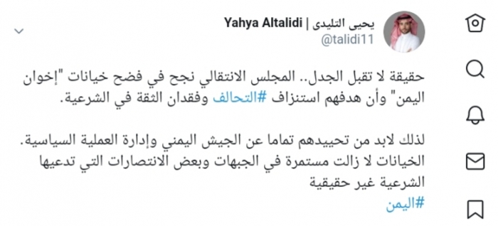 وكتب التليدي عبر تغريدة له على "تويتر" رصدها " المشهد العربي": "حقيقة لا تقبل الجدل، المجلس الانتقالي نجح في فضح خيانات "إخوان اليمن" وأن هدفهم استنزاف التحالف وفقدان الثقة في الشرعية".